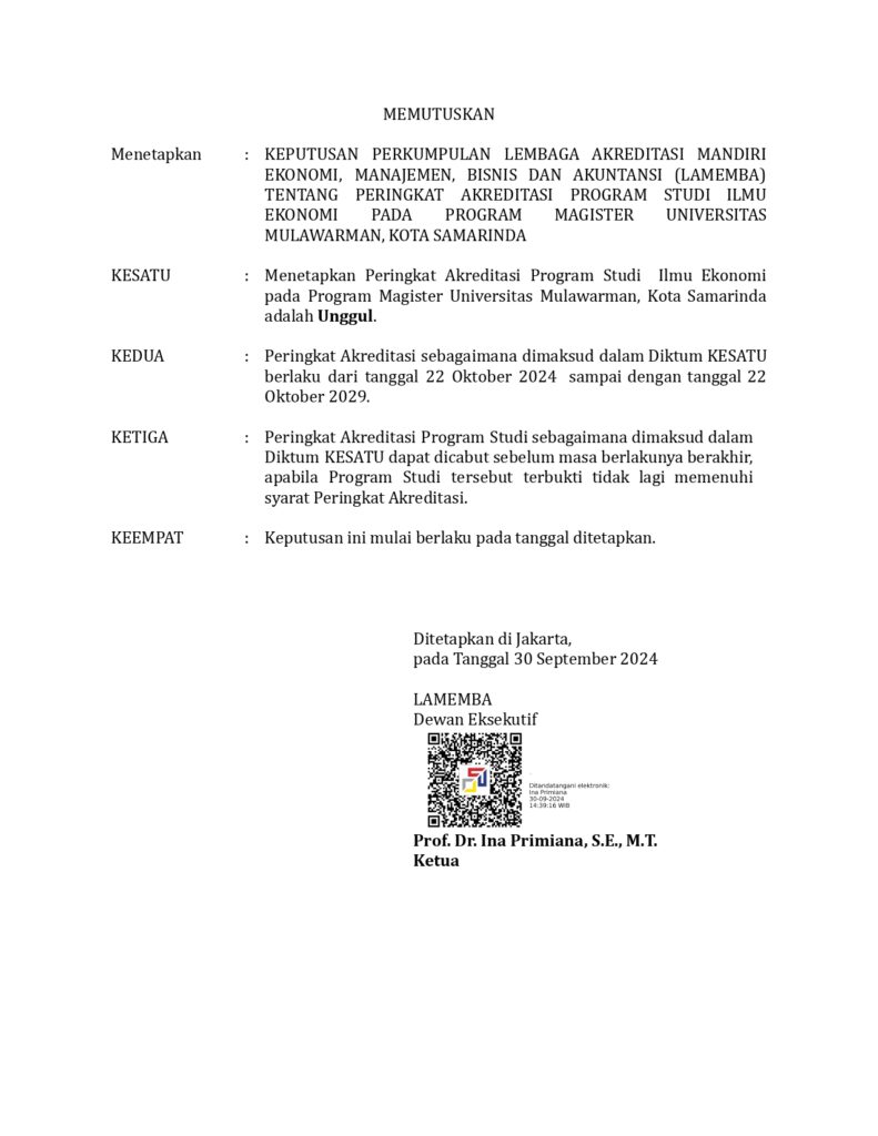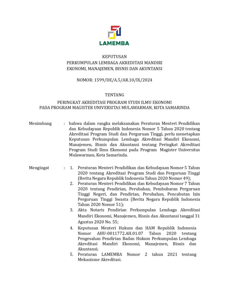 1. SK Nomor: 1599/DE/A.5/AR.10/IX/2024 tentang Peringkat AKreditasi Program Studi Ilmu Ekonomi pada Program Magister Universitas Mulawarman, Kota Samarinda